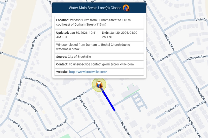 Windsor Drive in Brockville Closed Due to Watermain Break
