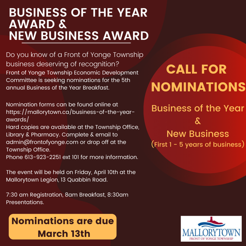 Mallorytown – There is still time to nominate a deserving business for this year`s Front...... Read more.